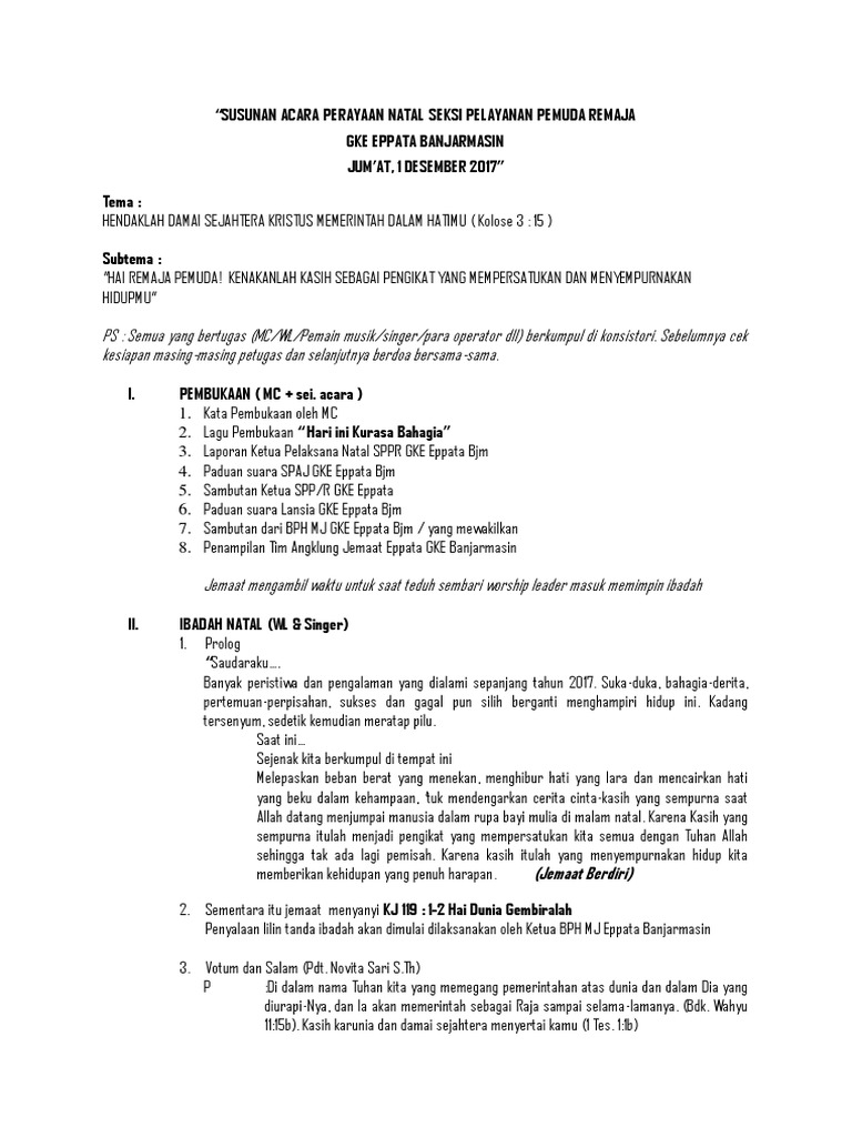 Tata ibadah malam penghiburan ke 2. 1) melihat serta memahami isi dari apa yang tertulis (dengan melisankan atau hanya dalam hati) contoh: Pada bulan desember perayaan natal sudah dimulai di berbagai gereja dimul. Natal adalah hari yang dipercaya mampu menghadirkan kebahagiaan dan penuh berkat. Contoh susunan acara natal pemuda doc document cute766 / di sini ada banyak kata kata motivasi bahasa inggris lengkap dengan arti beserta maknanya begitu dahsyat. Katakan kepada tuhanmu bahwa aku cuma ingin mencintai umatnya, tapi bukan merebut darinya. Mengingatkan akan pengorbanan yesus yang dengan kerelaannya mau menebus semua dosa umat manusia. Selamat malam dan salam sejahtera untuk kita semua. Kata kata yang saya sampaikan cukup sederhana dan jika ada tambahan kata kata biasanya secara refleks terucap seperti tuhan sudah menuntun bibir saya. Contoh mc acara natal : Saya undang bapak dan saudara untuk bangkit berdiri dan kita akan menyembah tuhan dengan satu pujian yesus padamu kuberseru karna dia selalu berserta kita. Contoh kata kata worship lieder (wl) saat memimpin pujian dan penyembahan. Kata mutiara natal adalah ungkapan syukur atas karunia yang telah dilimpahkan oleh tuhan yang maha esa.